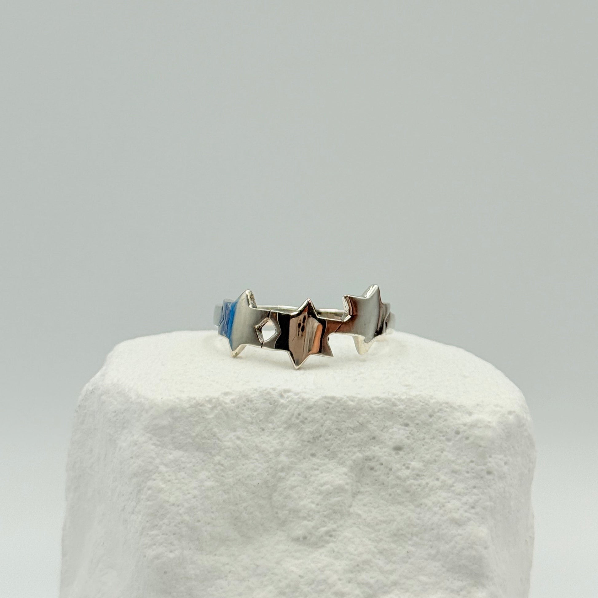 Ava is a sterling silver ring of 3 shining stars, a delicate band that captures celestial magic and keeps the cosmos close at hand.