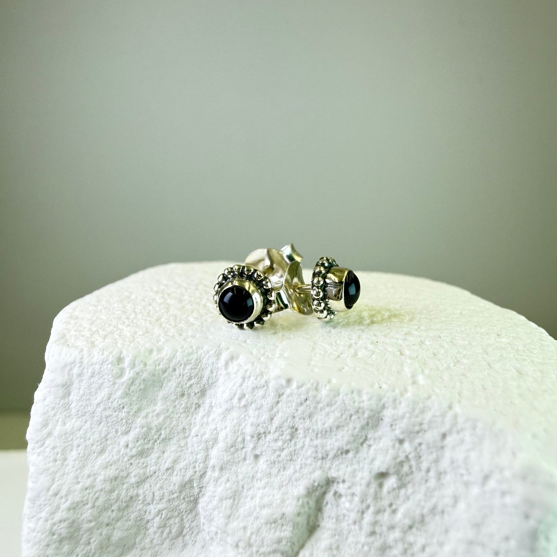 The Holly Black Tourmaline Studs are beautifully handcrafted in 925 sterling silver, featuring polished black tourmaline cabochons framed by an ornate beaded design. Their bold, grounding presence makes them both protective and effortlessly stylish.