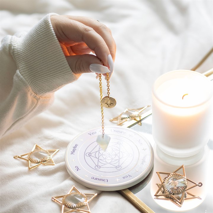 Unveil the secrets of the universe with the Opalite Pendulum Divination Kit. This kit includes a beautiful opalite pendulum, known for its ethereal glow and calming energy, making it a powerful tool for spiritual insight. The ceramic base showcases an intricate Flower of Life design with Yes, No, Maybe and Unsure answers to reveal your personal destiny. This kit is the perfect gift for someone who wants to explore the art of pendulum divination.