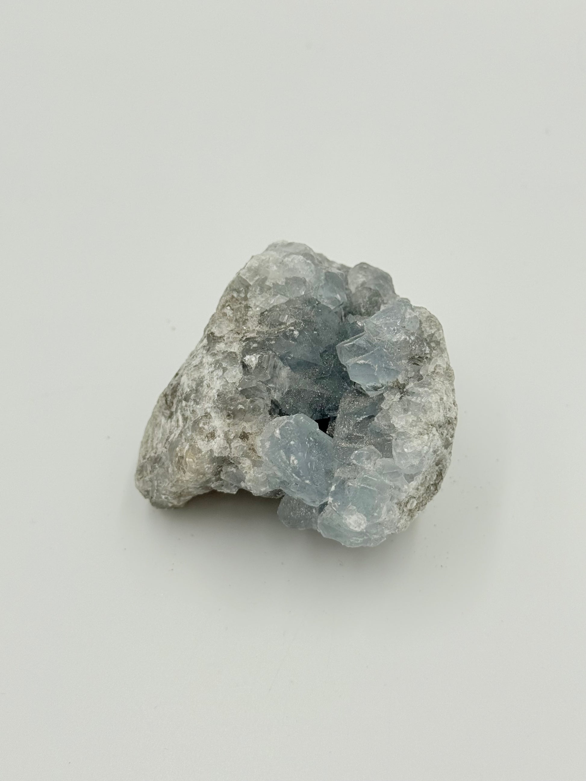 Celestite helps quiet the mind, ease stress, and promote emotional balance. It supports clear communication, both in relationships and in spiritual practices, making it a beautiful aid for meditation, prayer, or dreamwork. Its high vibration encourages connection with guides and enhances intuition, while also offering deep comfort during times of transition.