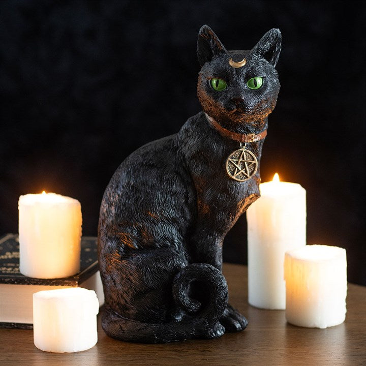 This sitting black cat figurine is a perfect gift idea for anyone who appreciates the mystery of black cats. With striking green eyes and a pentacle detail on it's collar, this ornament is a decorative detail that will add an element of magic to any home.