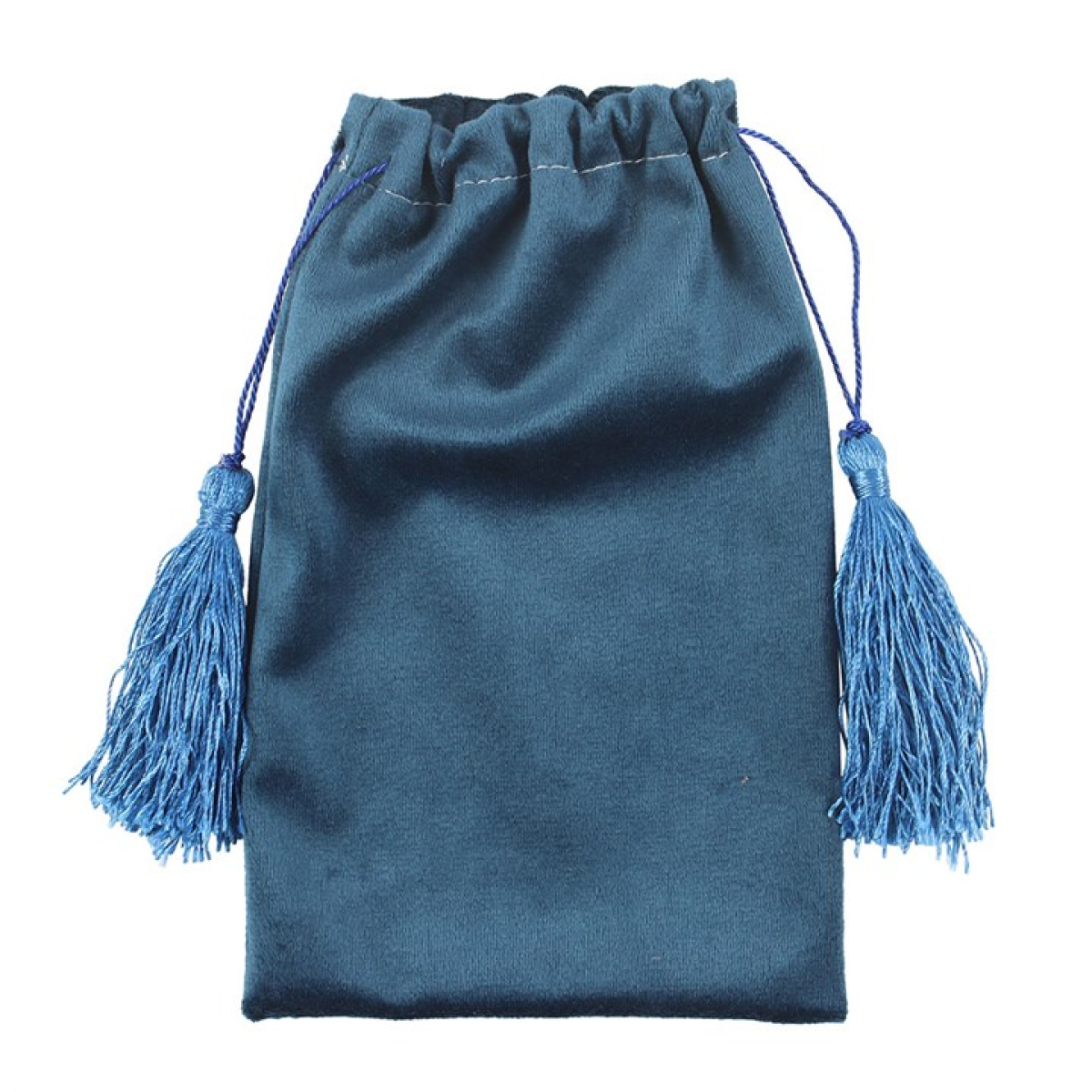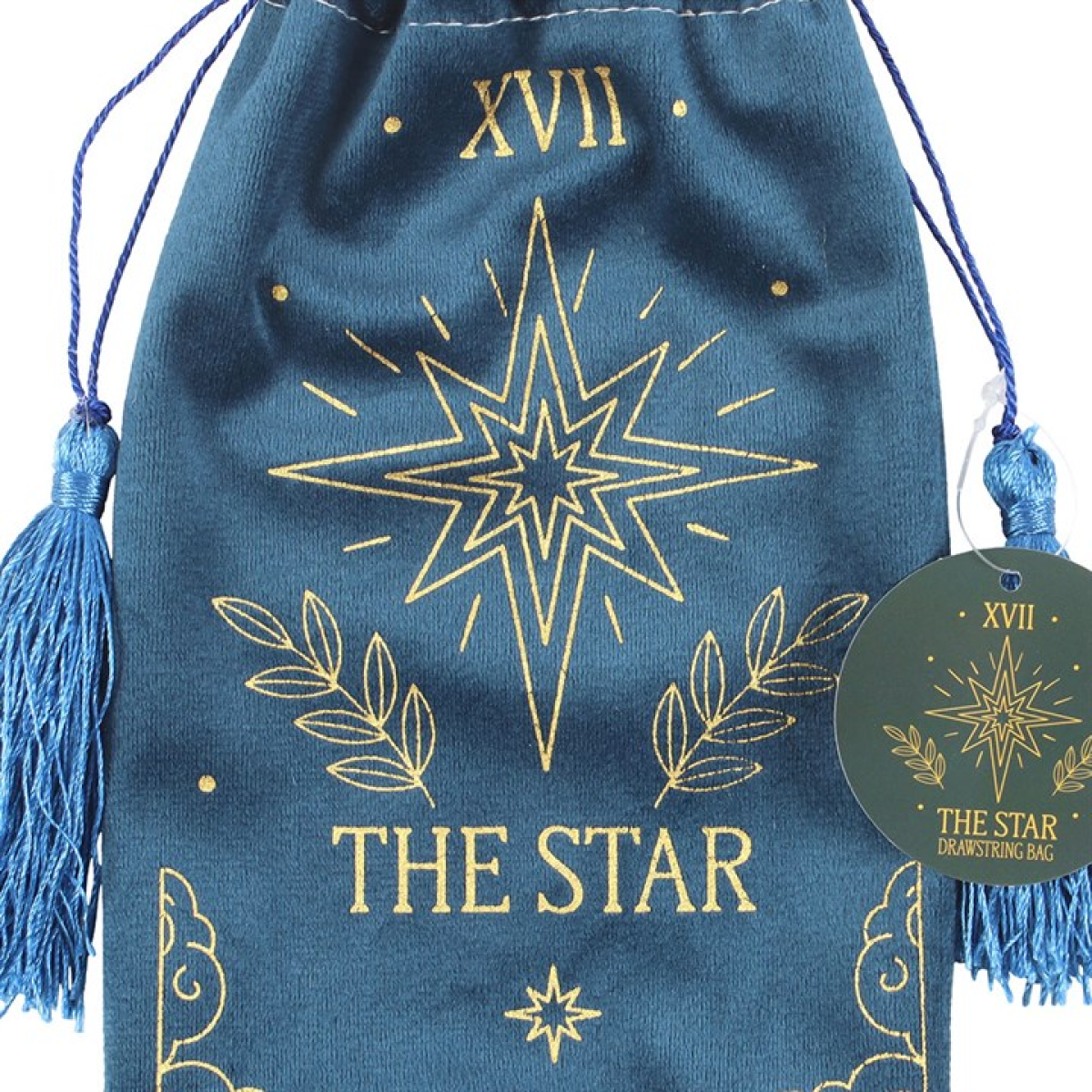 A soft blue velvet drawstring bag featuring a gold printed The Star tarot card design. Ideal for storing tarot decks, crystals, or small accessories.